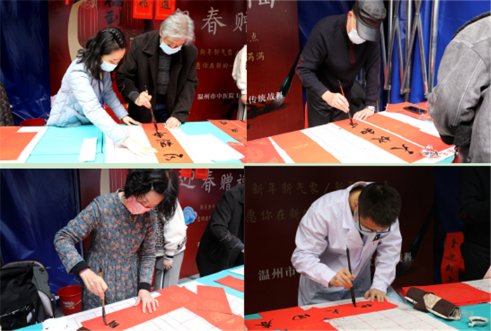 春联挂起、长桌排开、笔墨铺就,上午9时,温州书画家谢慈恩、杨建平、王兰玲及医院耳鼻喉科主治医师黄亚准时在现场挥毫泼墨,行、草等各种书体各显神韵,很快,一句句吉祥的话语,一声声祝福与期盼,一个个苍劲又灵动的大字跃然纸上,将墨迹凝结成新春的祝福送予大家。