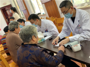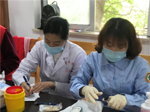 义诊团队对群众免费进行血压、血糖、血尿酸的测量。