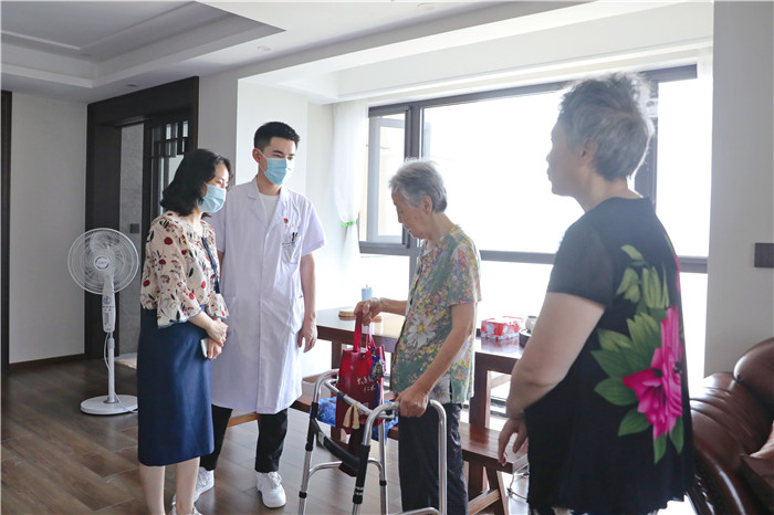 休养所16楼住着一位阿婆,一个月前因为摔跤导致骨盆轻度骨裂,医院纪委书记张伊凡和骨伤科医生等人组成的医疗团队也进行上门服务,看到阿婆已经可以扶着助行器缓慢行走,大家悬着的心也放下了,详细询问了病情,叮嘱了注意事项,并送上慰问品。