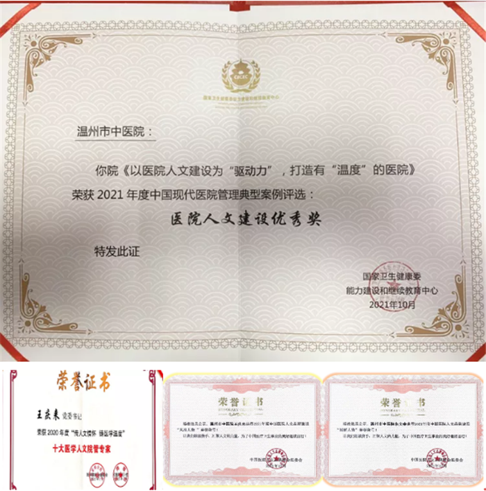 医院落实省级试点单位各项改革举措,积极挖掘提炼特色优势,推动医院向管理规范化、精细化、科学化发展,医院人文建设案例在2021年度中国现代医院管理典型案例评选中被国家卫健委评为优秀奖;党委书记王庆来在中国医院人文品牌建设评选活动中被评为“年度风尚人物”,院长朱文宗被评为“年度创新人物”,刘刚获浙江省“仁心仁术奖”。