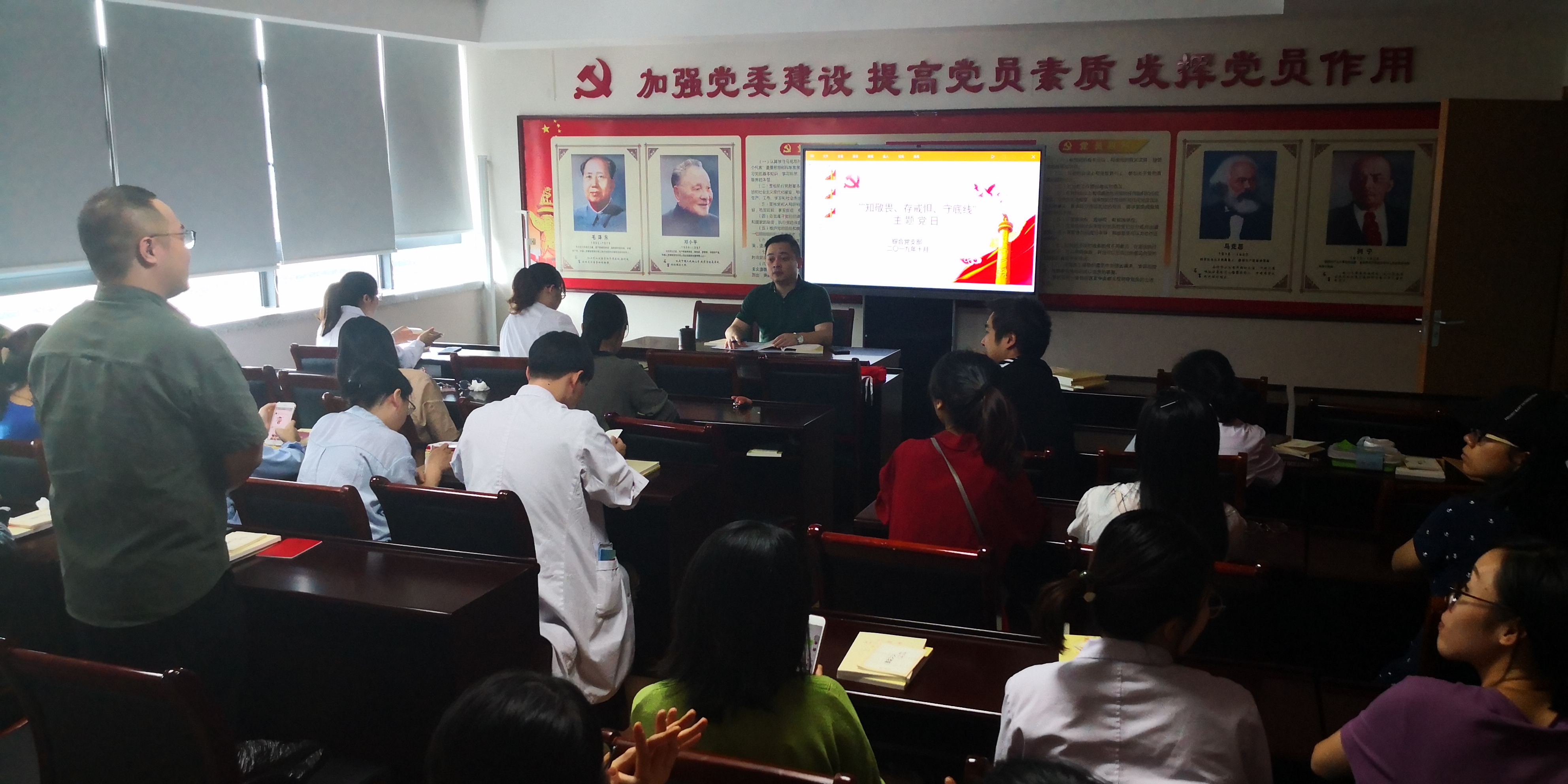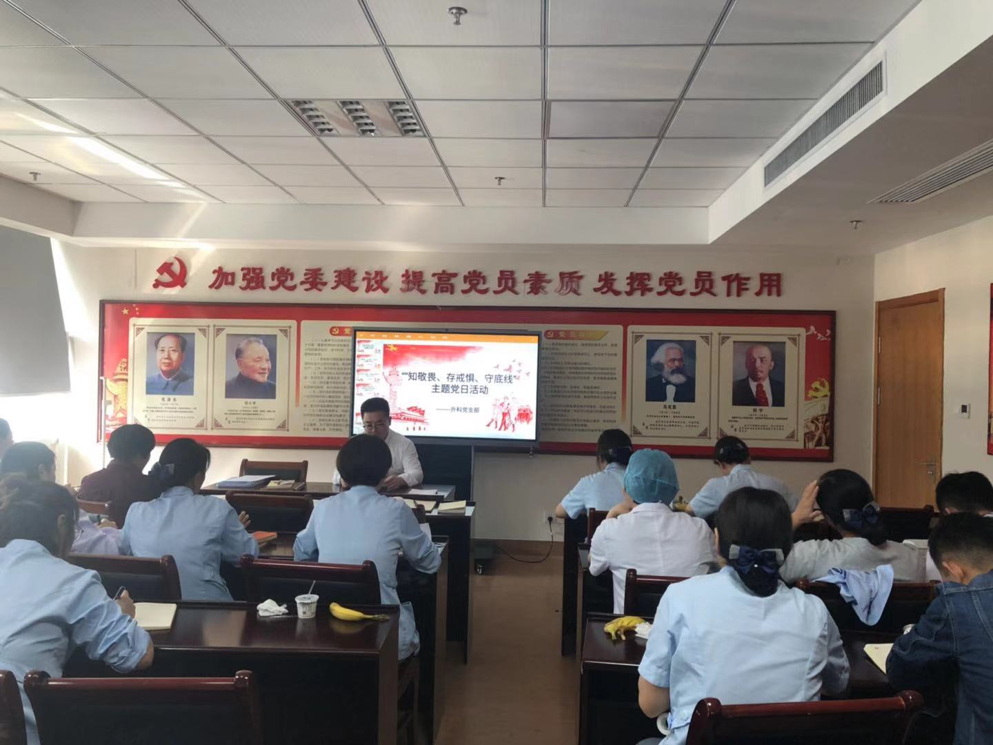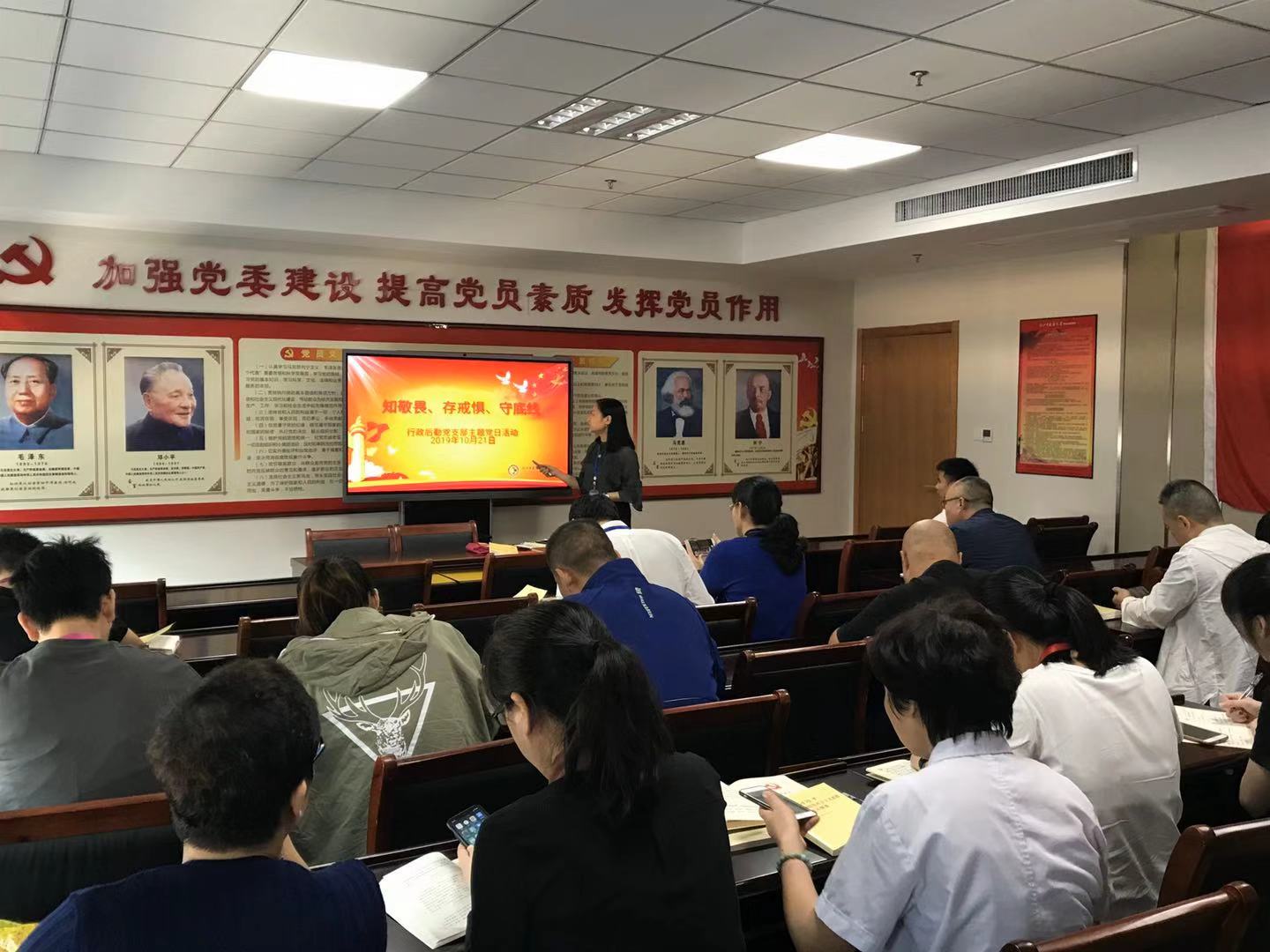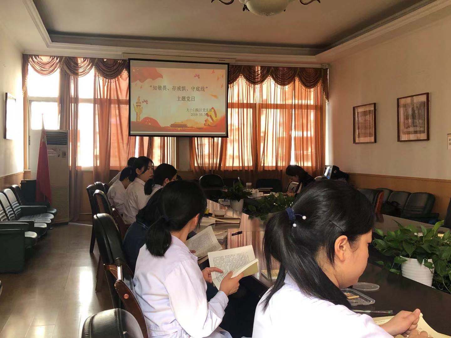 为深入贯彻习近平新时代中国特色社会主义思想和党的十九大四中全会精神,根据市委“不忘初心、牢记使命”主题教育部署要求,根据市卫健委《关于以“知敬畏、存戒惧、守底线”为主题集中开展支部主题党日活动的通知》内容,组织各党支部在11月15日前开展以“知敬畏、存戒惧、守底线”为主题的主题党日活动。