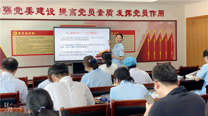 在听完赵娜同志的讲课后,金微微同志又带领大家深入学习了《浙江要建设好十个方面“重要窗口”》和《建设“重要窗口”贵在学深,重在谋新,成在做实》文件精神,支部将建设“重要窗口”作为第一工作要务,深入探讨支部建设、畅谈干事创业。